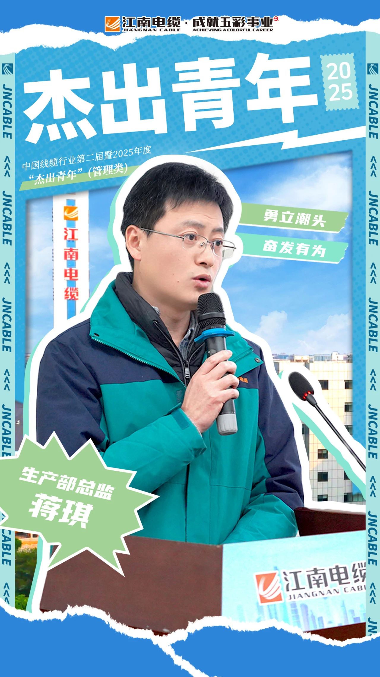 5月4日,中國(guó)線纜行業(yè)第二屆暨2025年度“杰出青年”評(píng)選結(jié)果正式揭曉。江南電纜生產(chǎn)部總監(jiān)蔣琪榮獲管理類“杰出青年”!